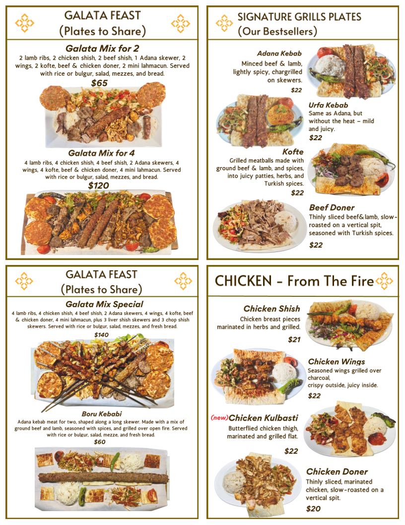 - Galata Feast: Perfect for sharing, the Galata Mix serves up succulent lamb ribs, chicken and beef shish, and a range of delicious mezzes, ensuring a feast fit for any gathering.